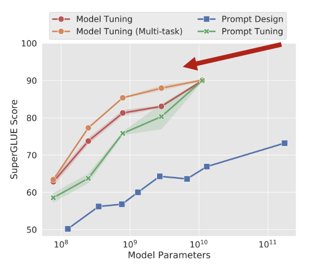 어마어마한 양의 파라미터 전체를 학습한 모델의 성능과 이보다 훨씬 적은 파라미터만 학습한 모델의 성능이 비슷하므로 prompt tuning 역시 하위 태스크로의 효율적인 적응 방법이다.