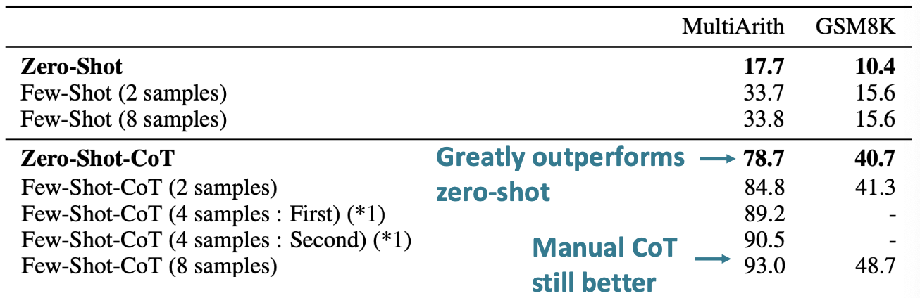 Zero-shot CoT prompting은 일반 zero-shot보다 훨씬 뛰어난 성능을 보인다.