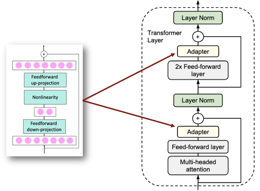 Adapter는 보통 multi-head attention 뒤나 feed-forward layer 뒤에 추가된다.