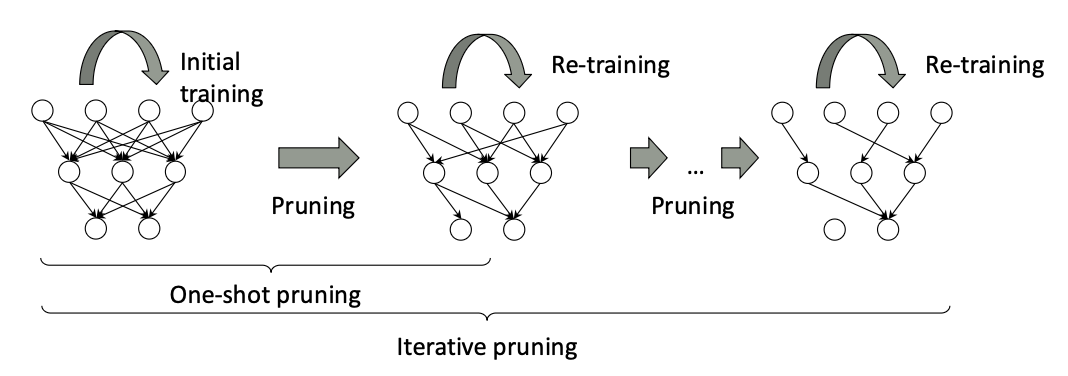 한번에 많은 가중치를 제거하는 방식보다 프루닝을 여러번 수행하여 가중치를 조금씩 제거하고 학습하는 방식이 더 자주 사용된다.