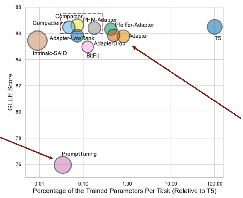 Adapter는 prompt tuning보다 성능이 더 좋지만 많은 파라미터를 학습해야 한다.