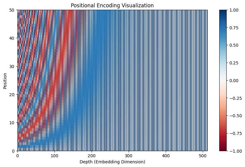 포지셔널 인코딩을 시각화하여 특징을 살펴 보겠습니다.
