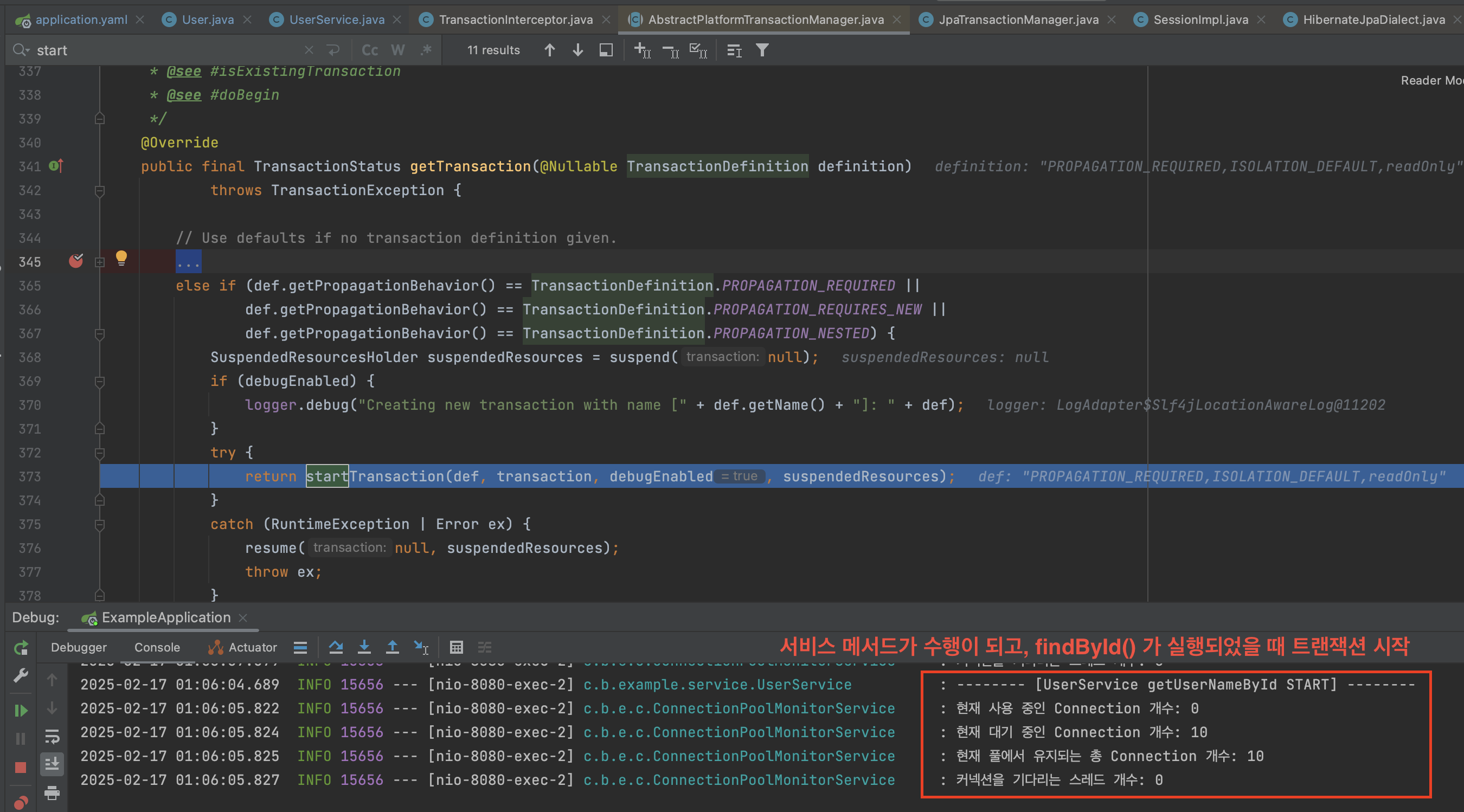 어노테이션이 붙지 않은 경우 서비스가 시작되었다는 로그까지 찍히고, findById() 를 실행시킬 때 getTransaction() 이 호출됩니다. 반면 어노테이션이 붙은 경우, 서비스단의 메서드를 호출할 때 바로 트랜잭션이 시작됩니다.