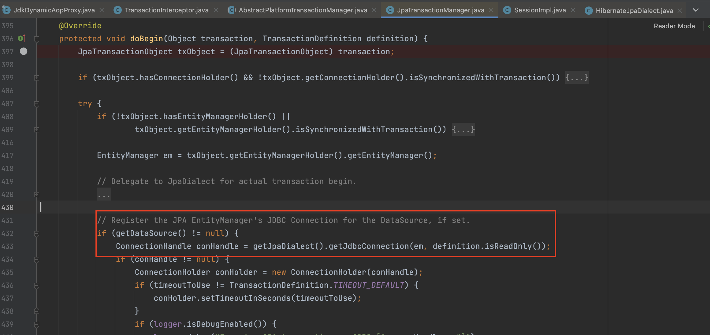 AbstractPlatformTransactionManager는 기존에 트랜잭션이 있으면 참여하고, 없으면 새로운 트랜잭션 시작JpaTransactionManager 의 doBegin() 메서드를 호출메서드에서 connection을 가져오는 부분은 바로 여기입니다! 즉, 참여하고 있는 트랜잭션이 없을 경우, 트랜잭션을 시작하고 그 때 호출되는 doBegin() 메서드에서 새로운 connection을 얻어오는거죠.