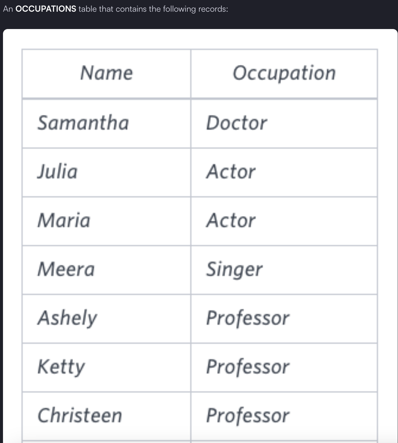 where [occupation_count] is the number of occurrences of an occupation in OCCUPATIONS and [occupation] is the lowercase occupation name. If more than one Occupation has the same [occupation_count], they should be ordered alphabetically.