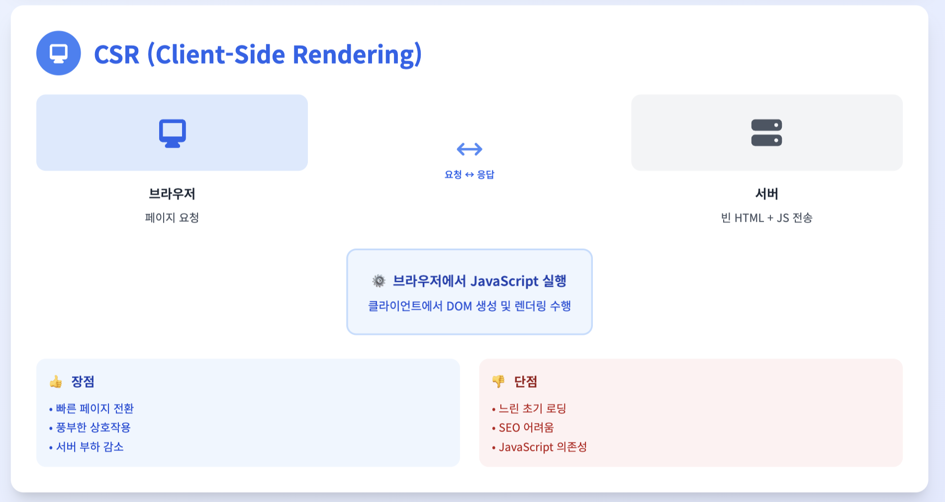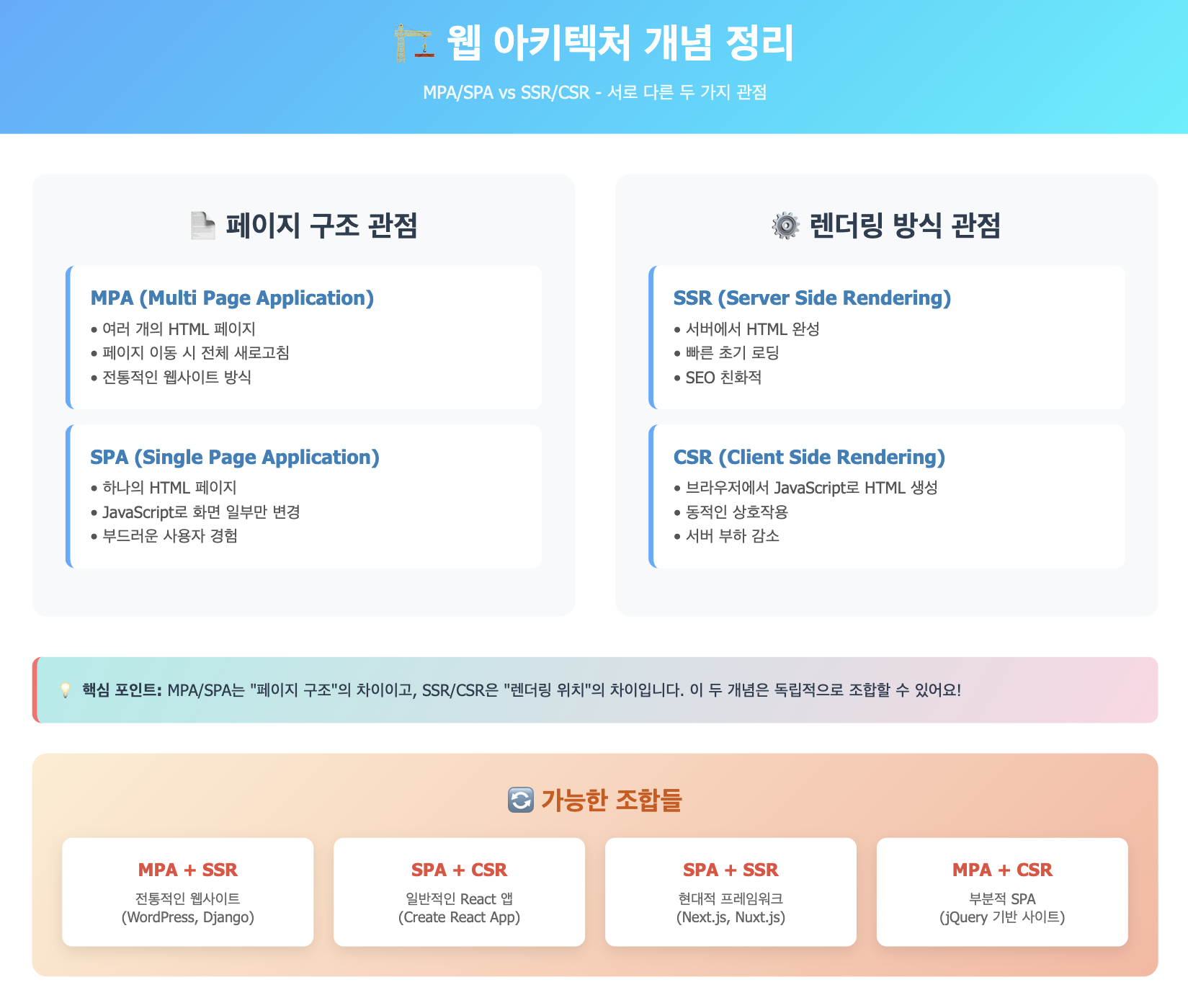- SSR/CSR은 렌더링 시점과 위치의 차이 (서버에서 HTML 완성 vs 클라이언트에서 JS로 HTML 완성).