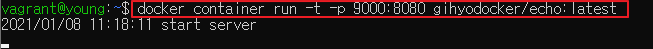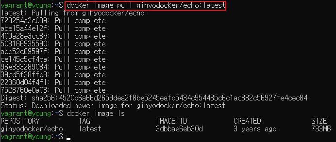gihyodocker/echo:latest 이미지를 가져온다. 해당 이미지는 docker의 Hello World 예제이다. docker image ls 명령어를 이용하면 로컬 레포지토리에 저장되어 있는 이미지를 조회할 수 있다.