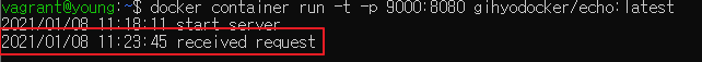 컨테이너를 실행한 터미널에서는 요청에 대한 로그가 출력되는 것을 확인할 수 있다.