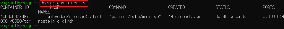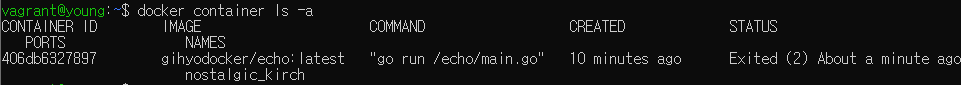 컨테이너를 조회하려면 docker container ls 명령어를 사용하면 된다. 위에 보이는 nostalgic_kirch는 컨테이너 이름을 명시하지 않았을 때 자동으로 생성해주는 컨테이너 이름이다.