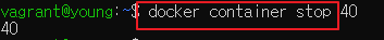 컨테이너를 중지하기 위해서는 docker container stop 명령어를 사용하면 되고, 컨테이너 이름이나 ID를 입력하면 해당 컨테이너가 중지된다. 이름이나 ID는 식별이 가능한 범위까지만 입력해도 된다.
