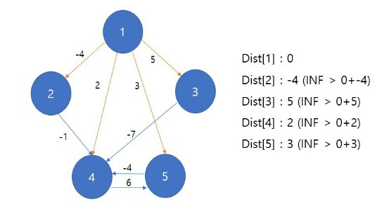 시작점 1의 인접 정점들을 탐색하며, Dist[노드]