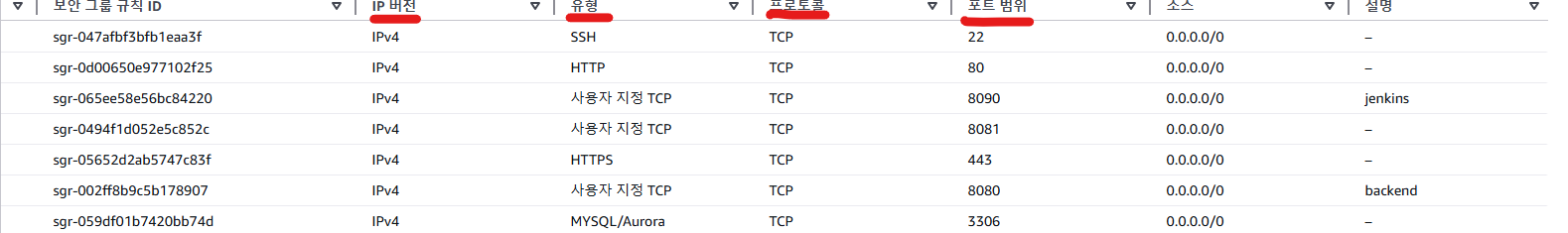 - 특정 IP 주소(예: 192.168.1.1/32) 또는 전체 인터넷(0.0.0.0/0)에서 들어오는 요청을 허용할지 설정