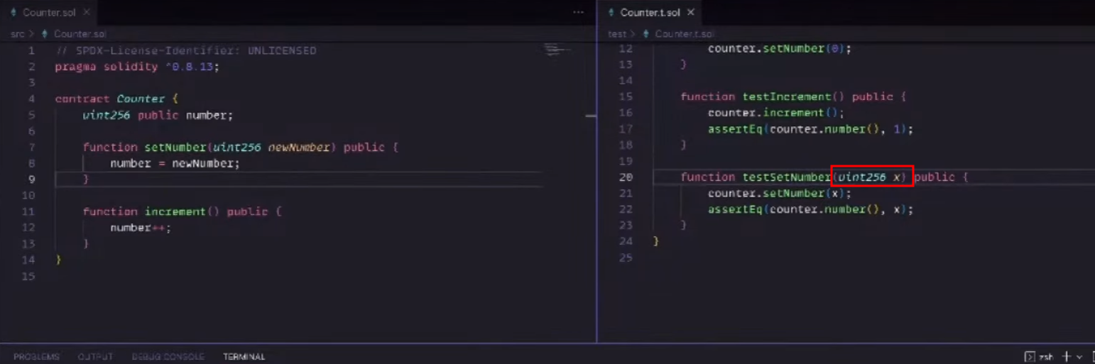 어디에도 x가 정의된 적이 없는데, 테스팅을 할 때 foundry가 임의의 값을 넣어서 테스팅을 진행한다는 점이다.