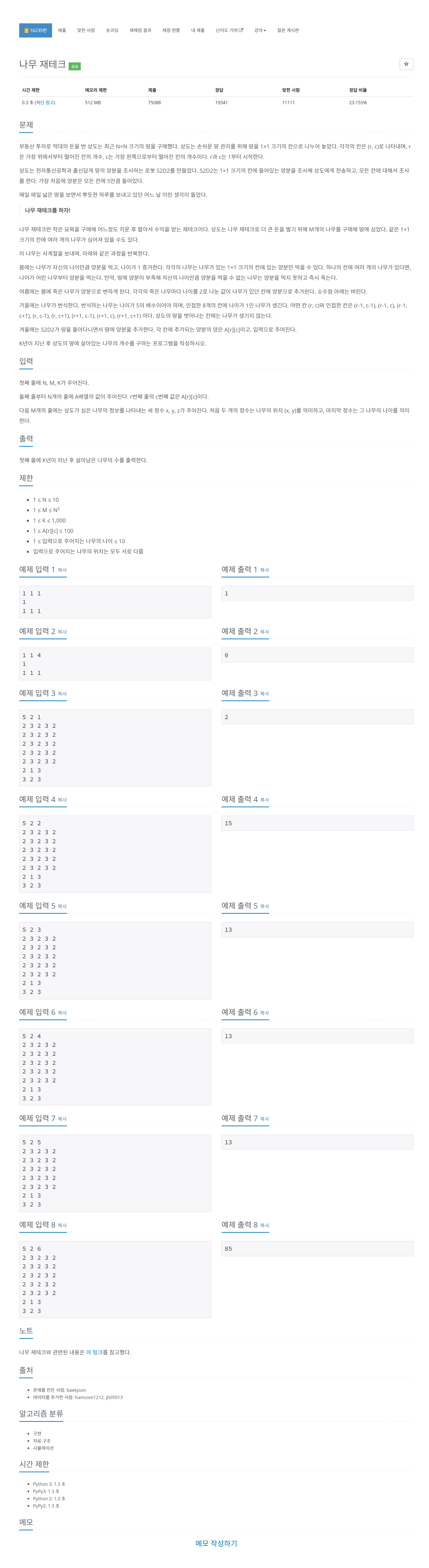 먼저 땅 크기 N, 나무 수 M, 연도 수 K를 입력받고, 겨울에 양분 추가 배열 A와 현재 양분 상태 nutrients를 초기화한다.