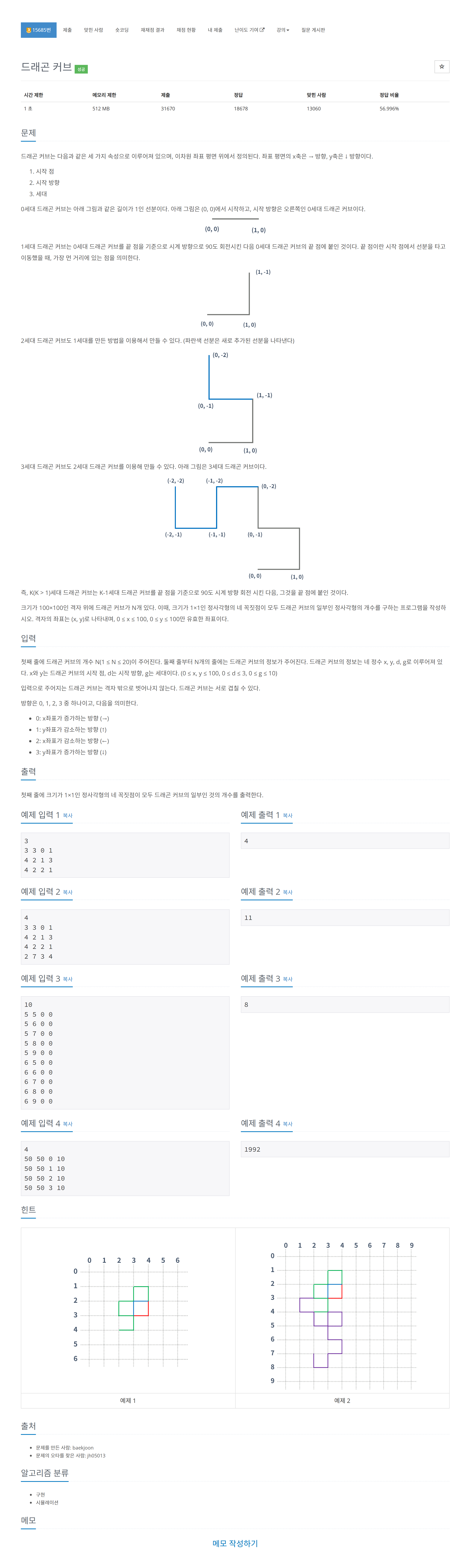 입력으로 주어지는 드래곤 커브는 격자 밖으로 벗어나지 않는다. 드래곤 커브는 서로 겹칠 수 있다.