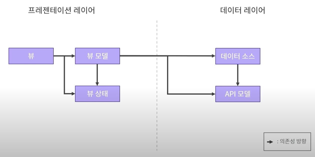 그렇다면 여기서 뷰모델과 뷰 상태는 어느쪽을 기반으로 구분이 되어야 자연스러운가하는 의문이 들었는데 지금까지의 코드가 뷰 안에 뷰모델부터 API모델까지의 코드가 전부 들어있는 상황이기도 하고 뷰는 결국에 뷰모델에 의존성을 가지기에 뷰 모델은 스크린 기반으로 분리하는게 자연스럽다고 생각했다.