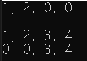 Console.WriteLine($"{a}, {b}, {c}, {d}");