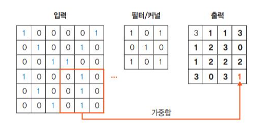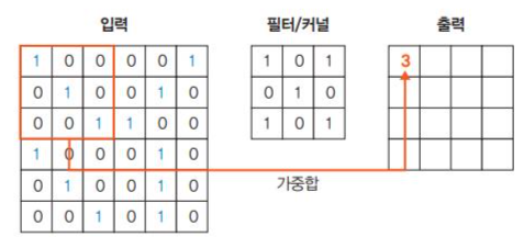 입력 이미지와 필터를 포개 놓고 대응되는 숫자끼리 곱한 후 모두 더한다.
