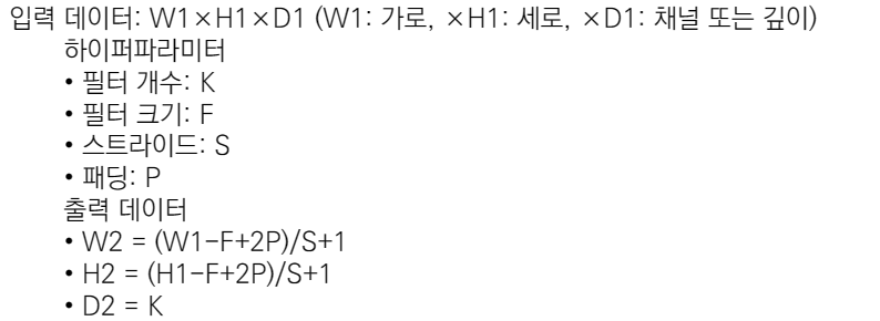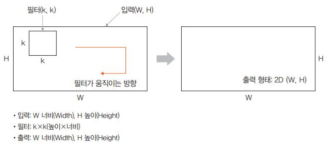 - 즉, 입력(W,H)과 필터(K,K)에 대한 출력은 (W,H)가 되며, 출력 형태는 2D 행렬이 된다.