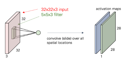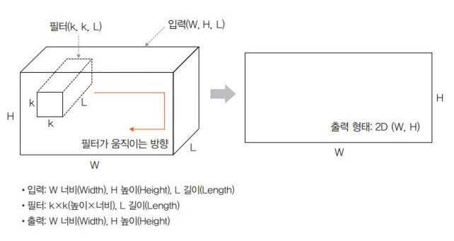 - 즉, 입력(W,H,L)에 필터(k,k,L)를 정용하면 출력은 (W,H)가 된다.
