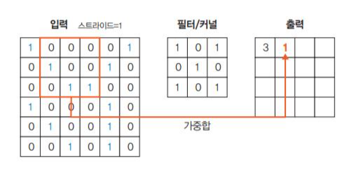 - 커널은 스트라이드 간격만큼 순회하면서 모든 입력 값과의 합성곱 연산으로 새로운 특성맵을 만들게 된다.