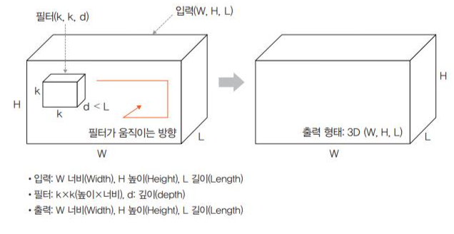- 입력(W,H,L)에 대해 필터(k,k,d)를 적용하면 출력으로 (W,H,L)을 갖는 형태가 3D합성곱이다.