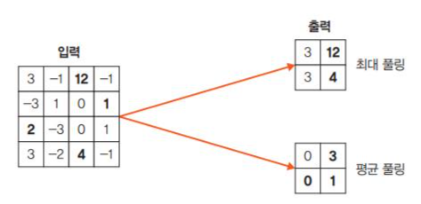 은 합성곱층과 유사하게 특성 맵의 차원을 다운 샘플링하여 연산량을 감소하는 것을 말하는데, max pooling은 대상 영역에서 최개밧을 추출하고 average pooling은 대상 영역에서 평균을 반환함을 뜻한다.
