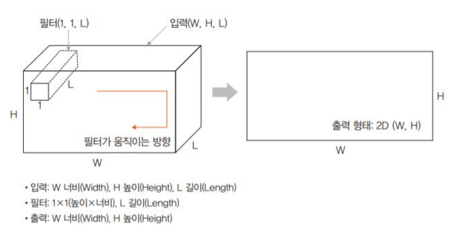 - 즉, 입력(W,H,L)에 필터(1,1,L)를 적용하면 출력은 (W,H)가 된다.