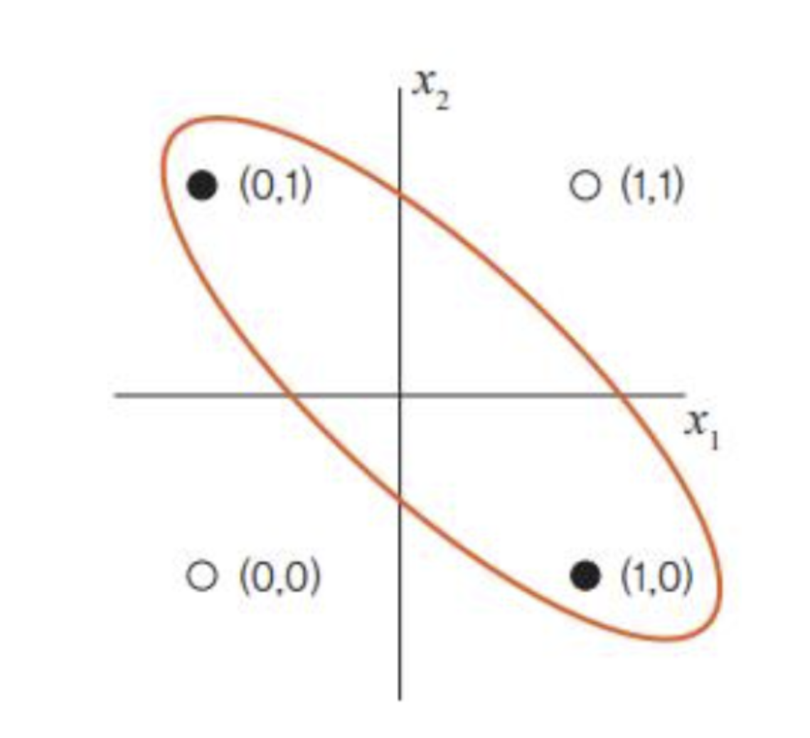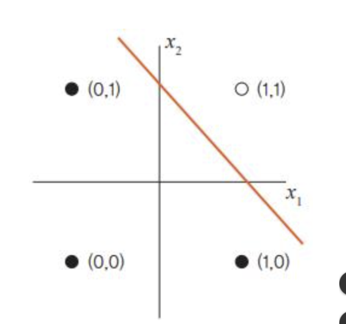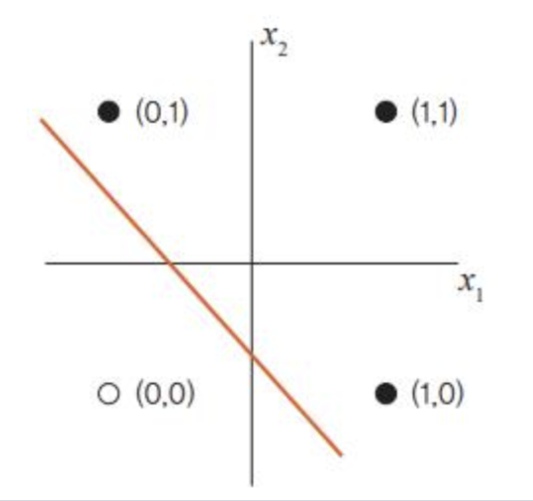 - 입력에서 둘 중 하나만 1이거나 둘 다 1일 때 작동. 즉, 입력 모두가 0을 갖는 경우를 제외한 나머지가 모두 1.