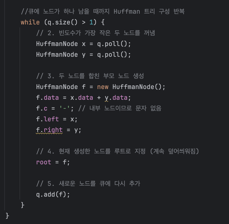 //큐에 노드가 하나 남을 때까지 Huffman 트리 구성 반복