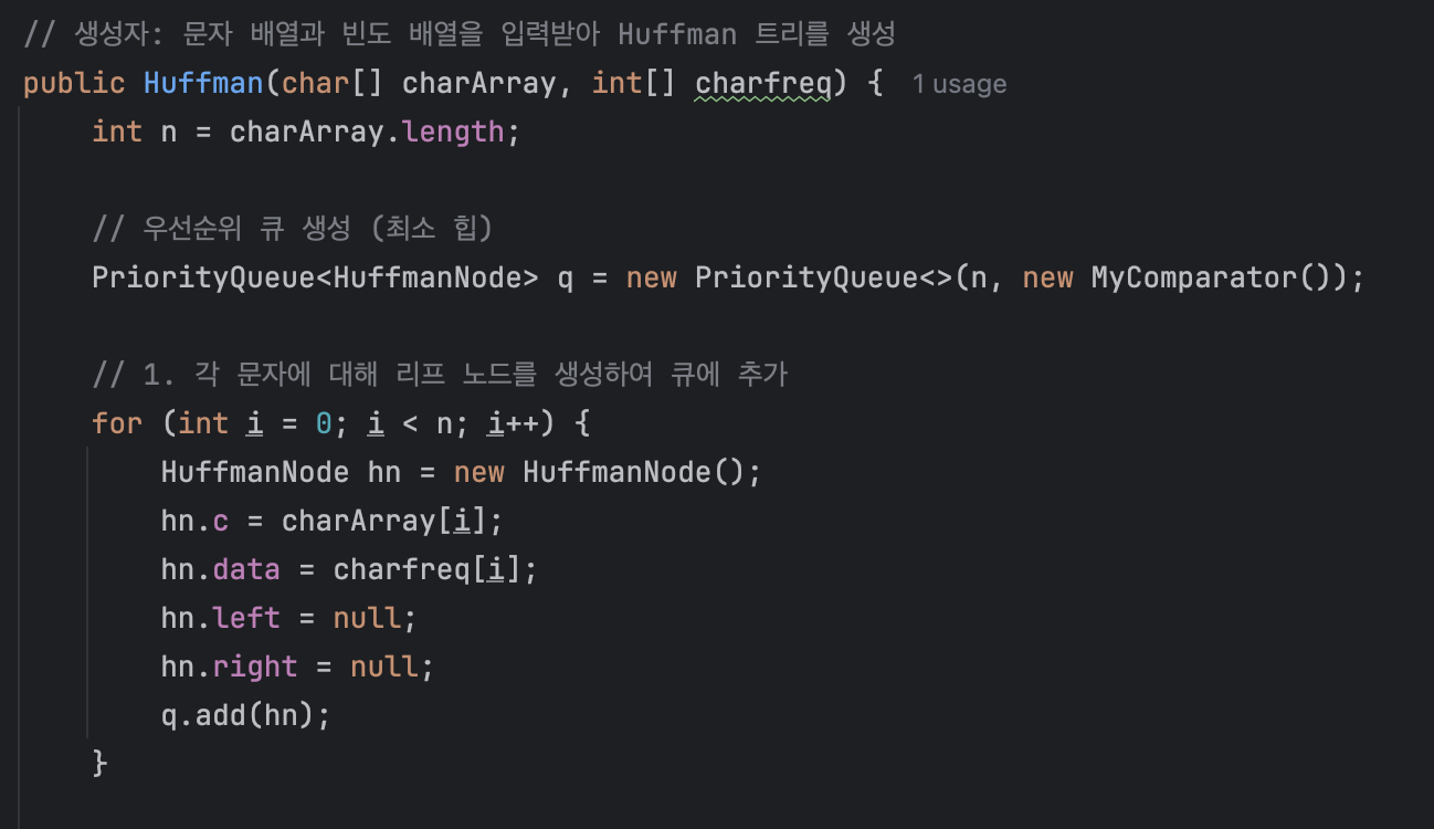 // 1. 각 문자에 대해 리프 노드를 생성하여 큐에 추가