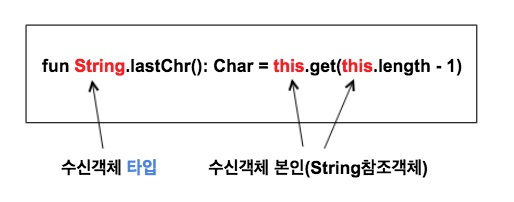 그냥 추가 함수 이름 앞에 그 함수가 확장할 클래스의 이름을 덧붙이면 된다. 클래스에 우리의 메서드를 추가하는 것과 같다. 수신 객체를 통해 사용자가 확장 중인 타입의 메서드와 프로퍼티에 접근할 수 있다. 자바 클래스로 컴파일된 클래스 파일이 있는 한, 이 클래스에 우리가 원하는 대로 확장을 추가할 수 있다.