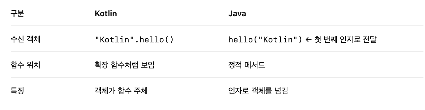 즉, 자바에서는 Kotlin의 확장 함수가 일반 static 함수처럼 컴파일되기 때문에, 원래 객체(=수신 객체)를 첫 번째 인자로 직접 전달해서 호출해야 한다는 뜻이다.