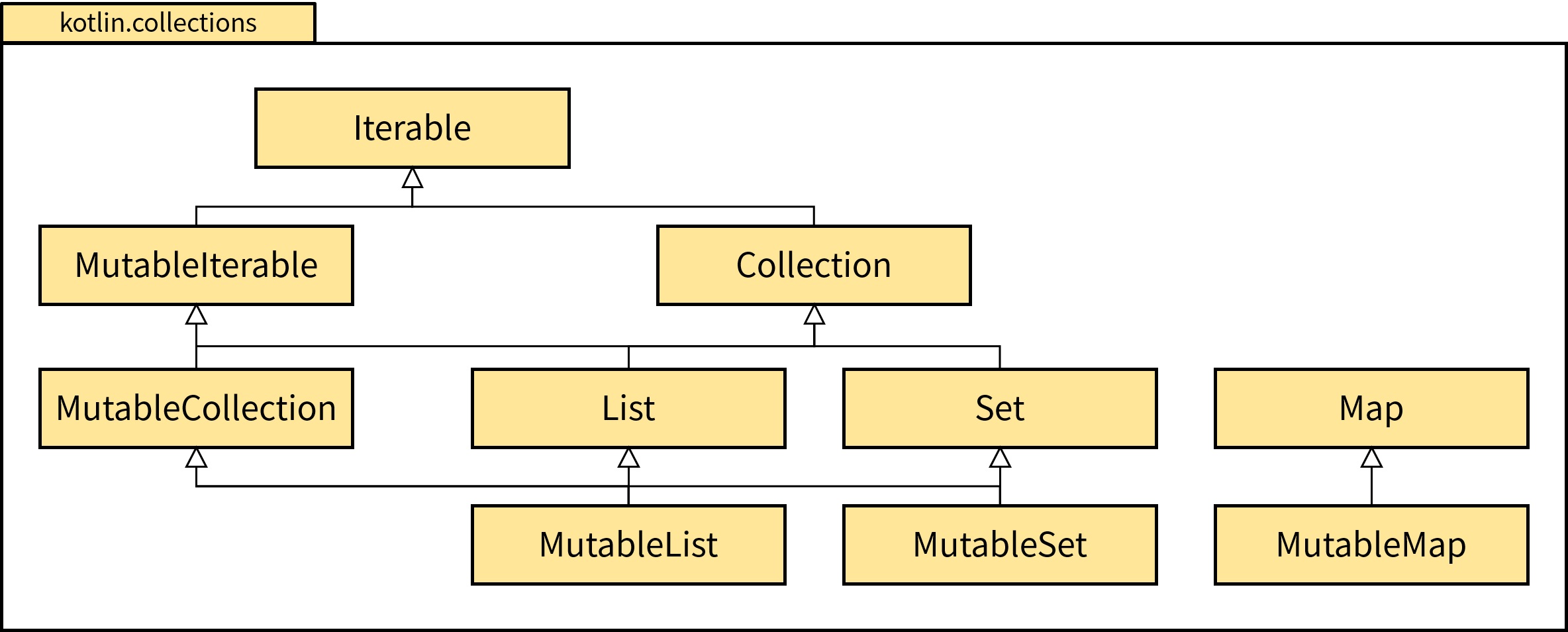 코틀린은 표준 자바 컬렉션 클래스를 사용한다. 즉, 자바와 코틀린 컬렉션을 서로 변환할 필요 없다. 코틀린 컬렉션은 자바 컬렉션과 같은 클래스이긴 하지만 코틀린에서는 자바보다 더 많은 기능을 쓸 수 있다.