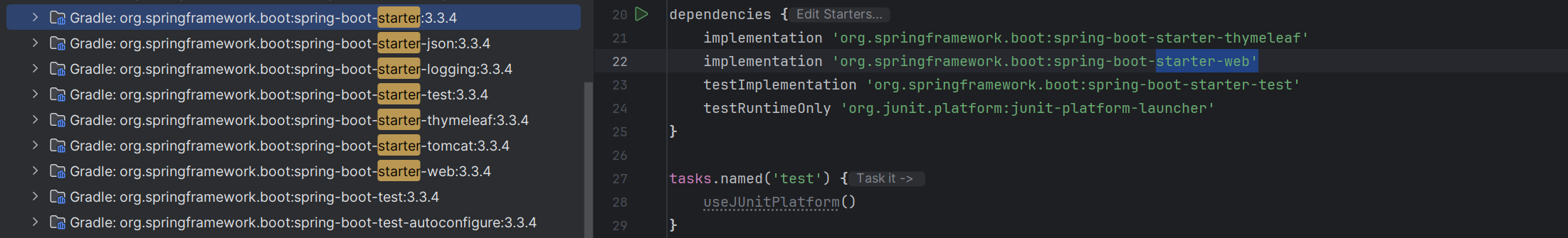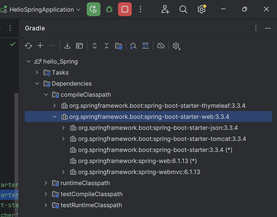 Alt 2번 누르면 오른쪽에 gradle 클릭 -> 라이브러리들의 의존관계 파악가능