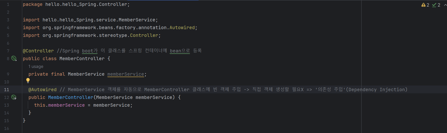 이와 같이 Controller 패키지 하위에 MemberController 클래스를 생성해주고, @Controller라는 어노테이션을 달게 되면, Spring boot가 자동으로 이 클래스를 스프링 컨테이너에 Bean으로 등록시킨다. 그리고 이 클래스는 MemberService를 사용해야 하기 때문에, 생성자를 생성해주고, @Autowired라는 어노테이션으로 '의존성 주입' 즉, 자동으로 주입할 객체를 해당 클래스에 빈 객체로 주입시켜줌으로써 직접 객체를 생성할 필요가 없게 만들어준다.