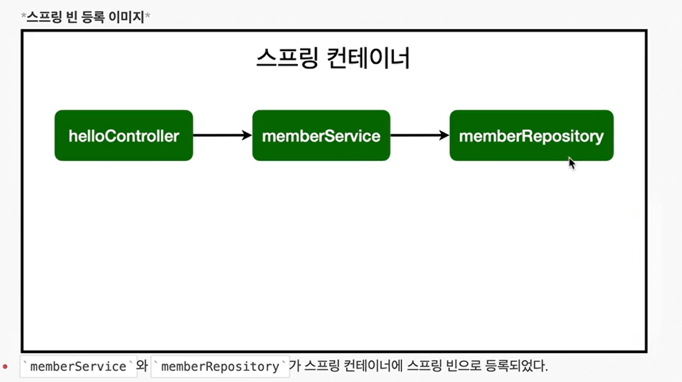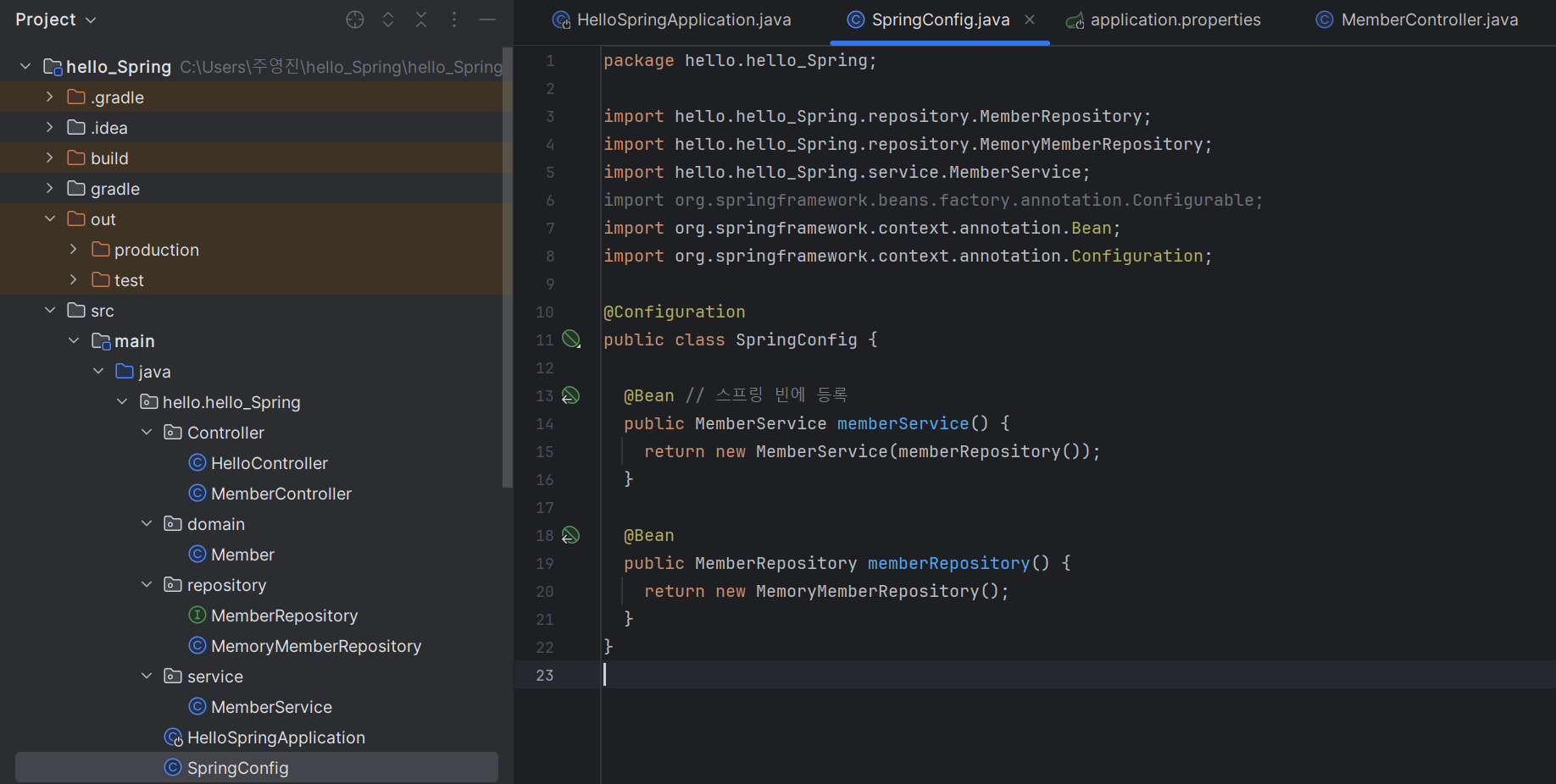 자바 코드로 직접 스프링 빈을 등록하기 위해서는, SpringConfig라는 클래스를 만들어 @Configuration이라는 어노테이션을 달아 이 클래스가 설정 파일처럼 작동하며, 하나 이상의 빈 메서드들을 포함할 것이라는 것을 표시해준다. 그리고 이 클래스 안에 @Bean 어노테이션을 활용해 각각의 의존관계들을 설정해주면 된다. Controller는 예외적으로 그대로 Controller 클래스에서 컨트롤러 어노테이션으로 의존성 주입을 실행한다.