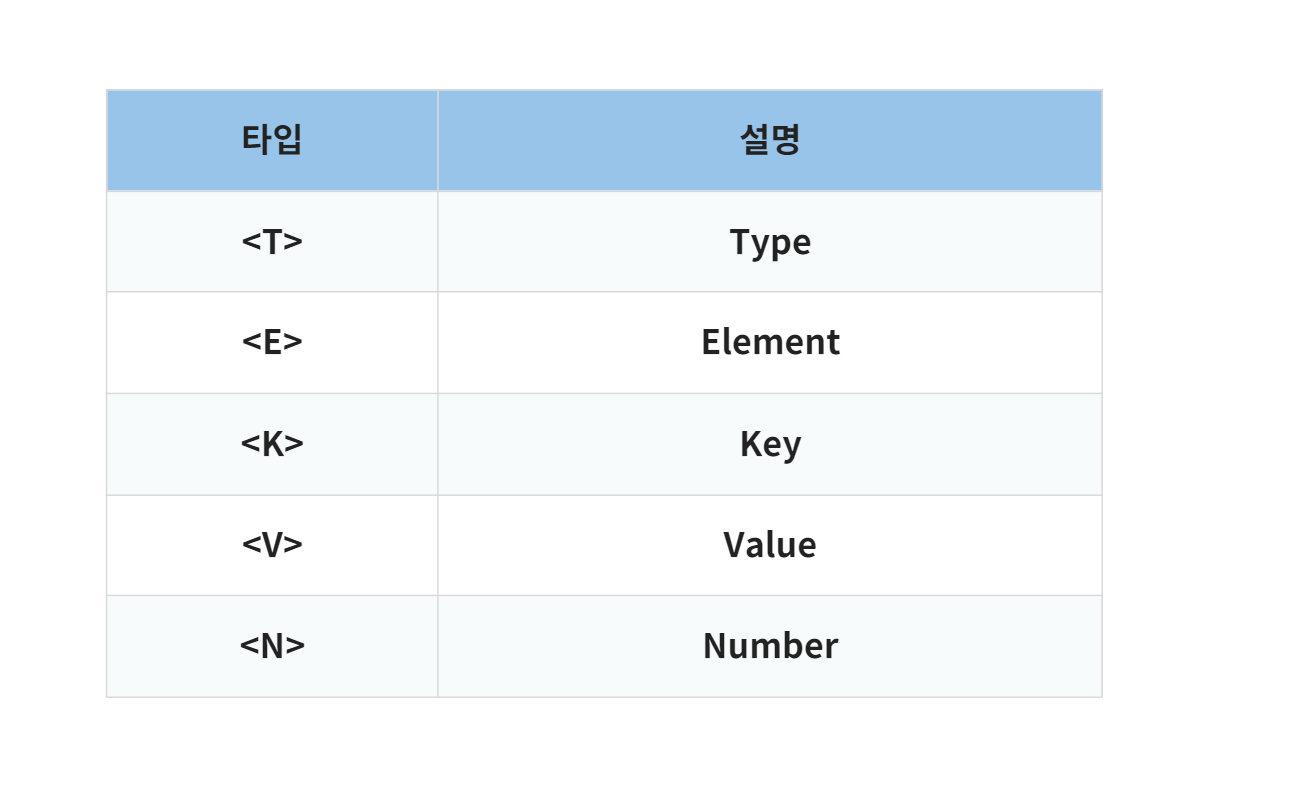 다음과 같은 타입이 제네릭에 주로 많이 쓰인다.