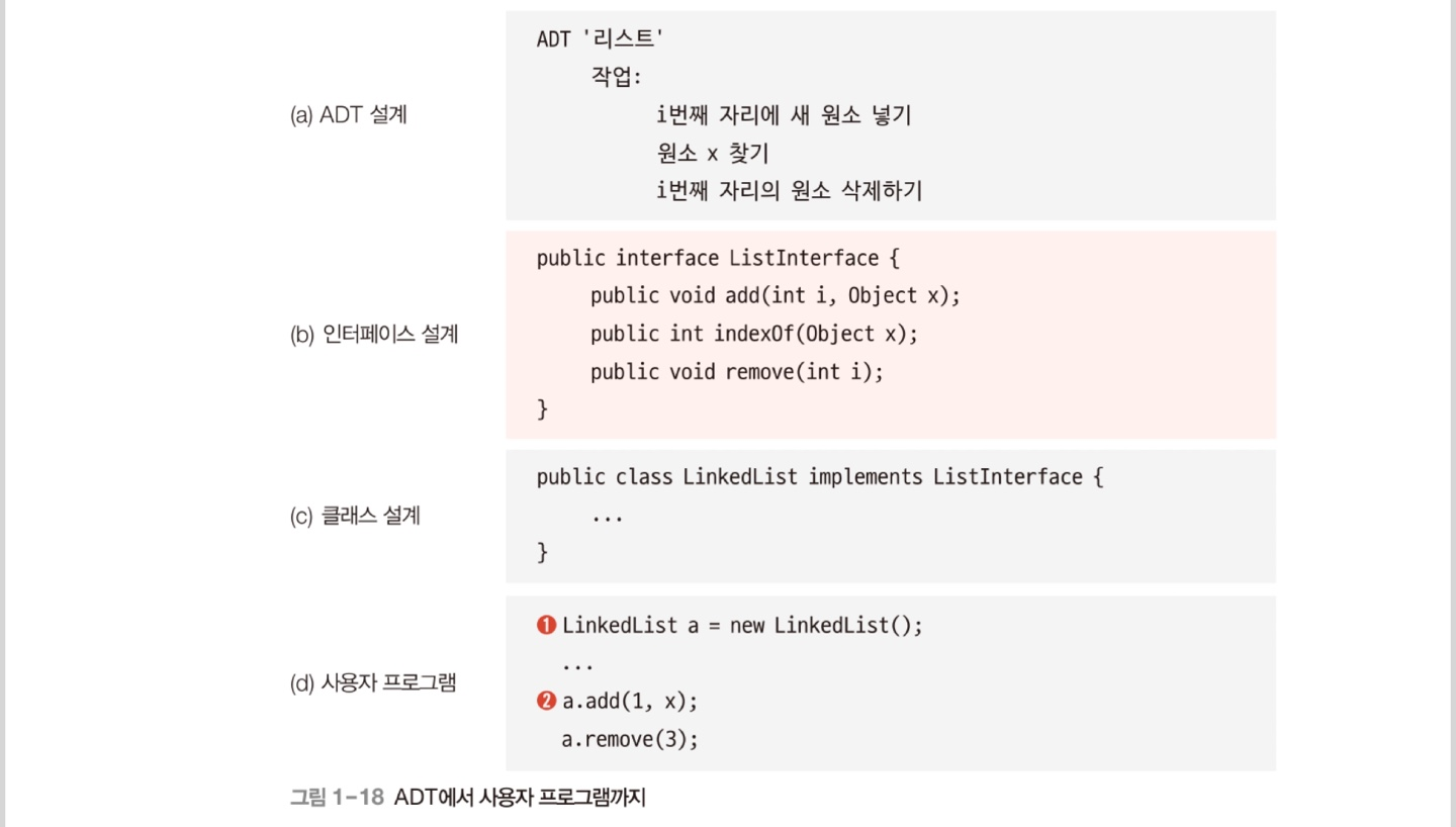 이 그림은 자바에서 ADT에 가까운 기능인 Interface를 사용하는 방법을 보여준다. ListInterface란 이름의 인터페이스를 따르는 클래스는 (b)에 나열된 3개의 작업을 수행하게 되는데, (c)에서와 같이 implements를 활용해 이 인터페이스를 따르는 클래스를 정의할 수 있다. 그럼 사용자 프로그램에서는 (d)와 같이 객체만 할당받아서 타입에만 맞게 함수를 사용하게 되는데, 이 과정은 '추상적 수준'에서 자료를 취급할 수 있게 해주는걸 보여준다.