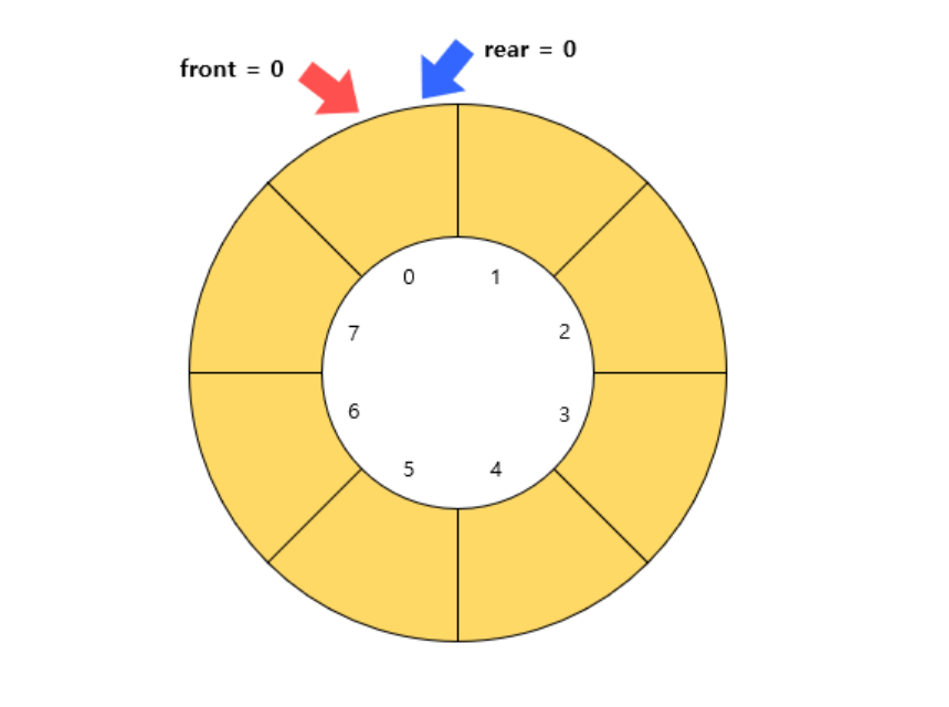 이런 식으로 원형 큐란 배열을 원 모양으로 둥글게 말은 형태를 상상하면 이해하기 쉽다. 이는 앞서 말한 배열을 이용한 큐의 공간 사용의 비효율성 문제를 해결할 수 있는 자료구조 형태이다. rear(tail)이 배열의 마지막에 도달했다고 해도 배열의 맨 앞(front)의 원소가 빠져서 빈 공간이 생기면 rear은 다시 처음으로 돌아와 0의 자리에 원소를 저장할 수 있다.