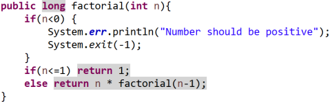 앞서 언급한 factorial을 재귀를 활용한 자바 코드로 짜보면 이와 같다. factorial 함수 안에 n-1 크기의 동일한 함수가 포함되어 코드가 효율성 있게 짜진 것을 확인할 수 있다.