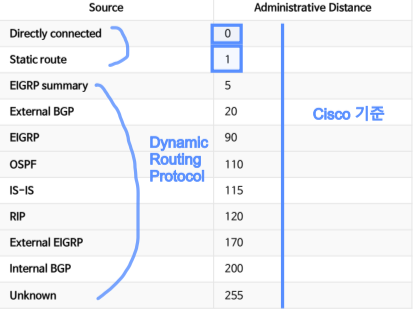 - 하나의 목적지에 대해 두개 이상의 라우팅 프로토콜이 경로를 제공하고 있을 때 해당 경로를 라우팅 테이블에 인스톨하기 위한 라우팅 프로토콜 신뢰도