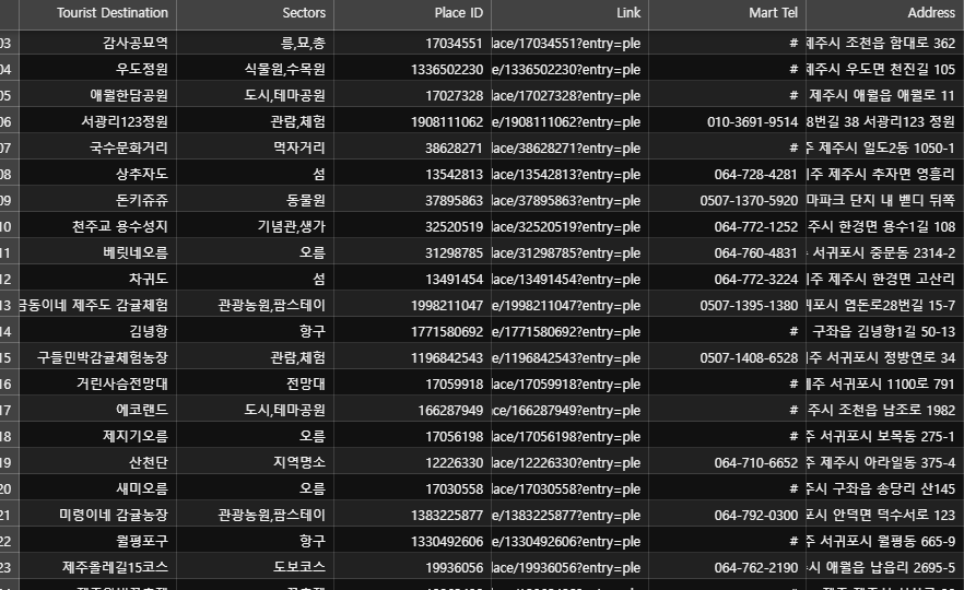 지금 기입한 정보는 관광지명, 분류, PLACE ID, 링크, 마트 정보, 주소 뿐이지만, 우선 리뷰에서 뽑아낸 인덱스 단어들을 추가하고 나중에 시간이 남고 성능이 괜찮으면 네이버 리뷰 정보 전체를 다 추가해보는 것으로 합시다.
