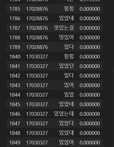 일단 리뷰 수가 적은 순으로 place_ids를 출력한 다음, 그들의 핵심 단어들을 보았다. 그러니까 문제가 됐었던 힝힝, 밌었던, 밌다, 밌어들이 있었다.