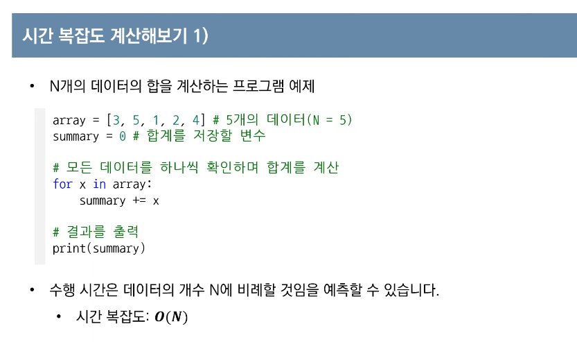 - 위 코드를 보면 array 배열에 들어 있는 값들을 모두 더해주는 계산이므로 배열의 값만큼 시간 복잡도가 생김.