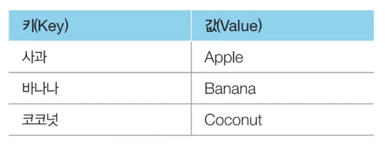 - 이때 키나 원소의 값으로는 변경 불가능한 문자열이나 튜플과 같은 객체가 사용되어야 함.