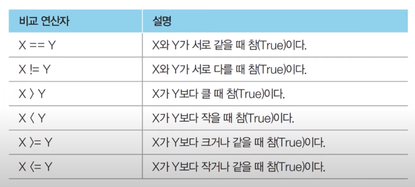 - 비교 연산자 : 특정한 두 값을 비교할 때 이용.