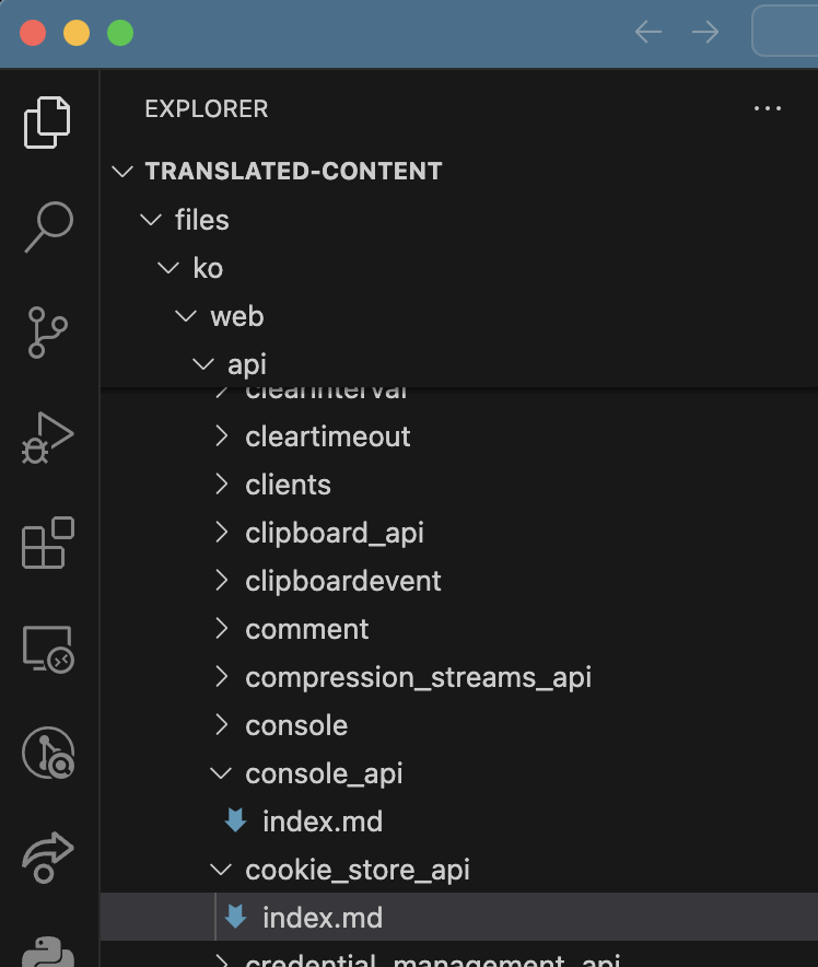 나의 경우, cookie store api는 영어 원문에서 files/web/api/cookie_store_api에 있었으므로 정확히 files/ko/web/api/cookie_store_api 아래에 index.md를 추가해줬다. cookie_store_api 폴더가 기존엔 없었으므로 폴더를 추가하고 안에 index.md를 추가해줬다.