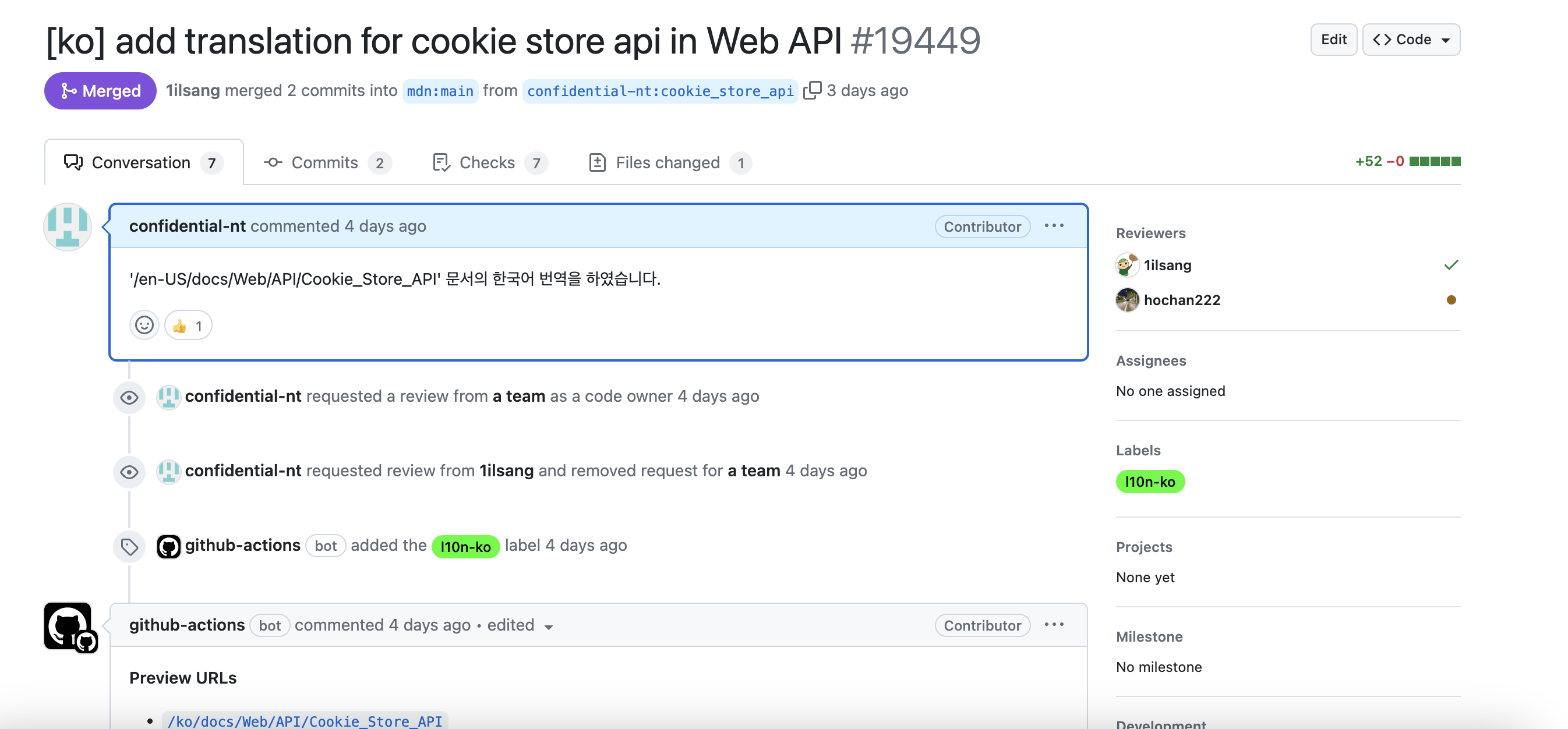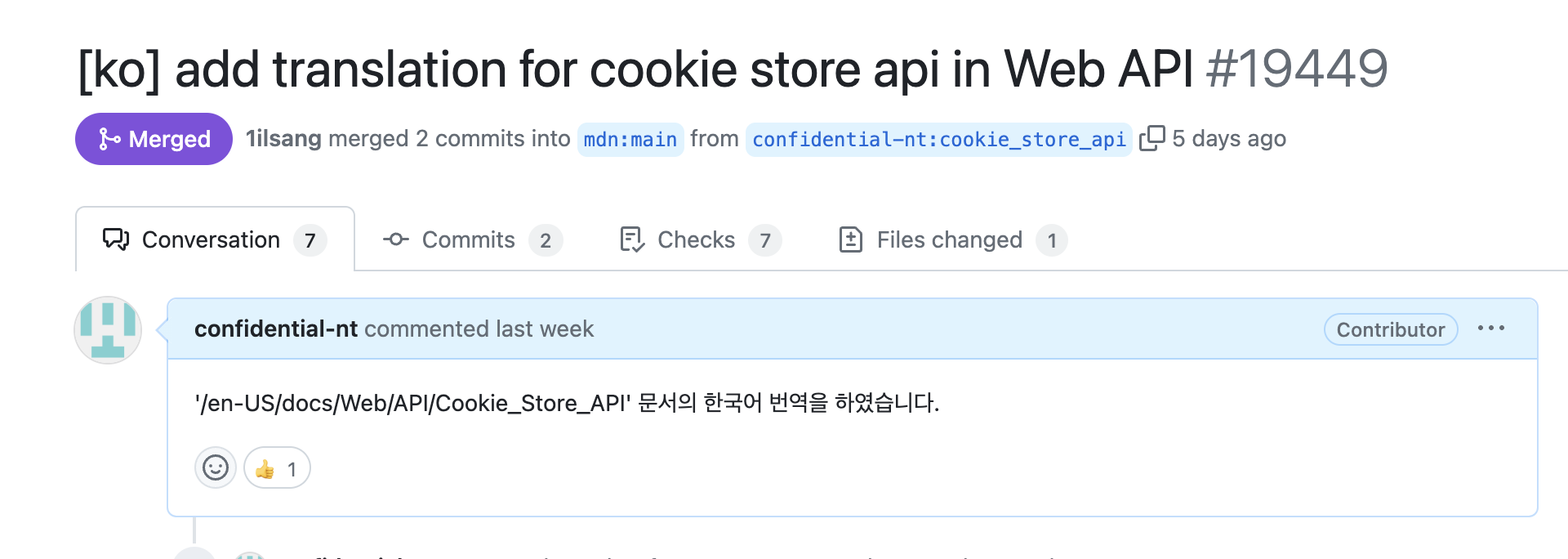 며칠 전 MDN 공식 문서 한국어 번역에 기여했다.