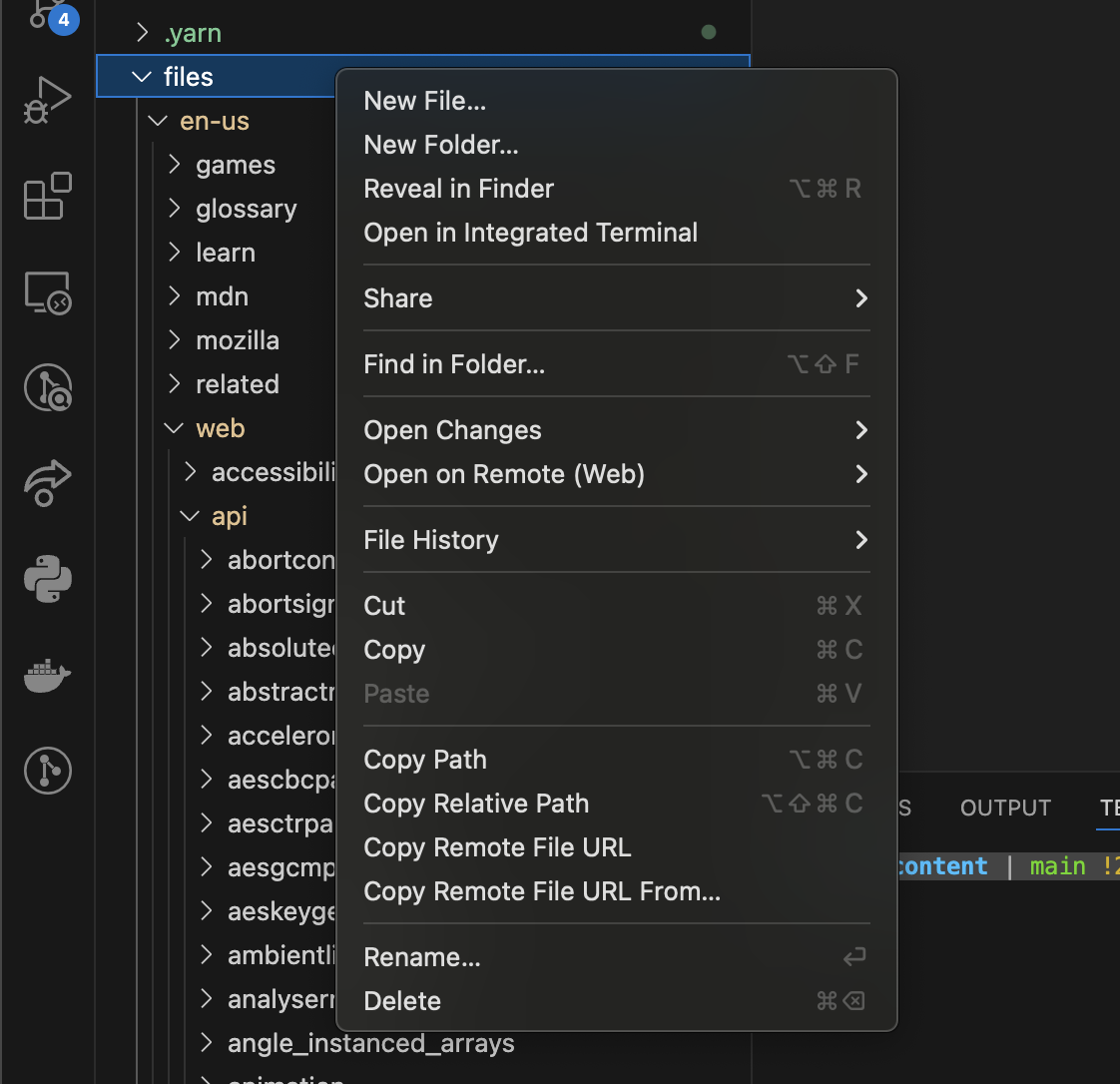 CONTENT_TRANSLATED_ROOT 값은 vs 코드에서 translated-content를 열고 files 폴더를 찾은 다음, 오른쪽 마우스를 클릭하여 'Copy Path'를 통해 얻으면 된다.(상대 경로가 아닌 절대경로여야 한다!)